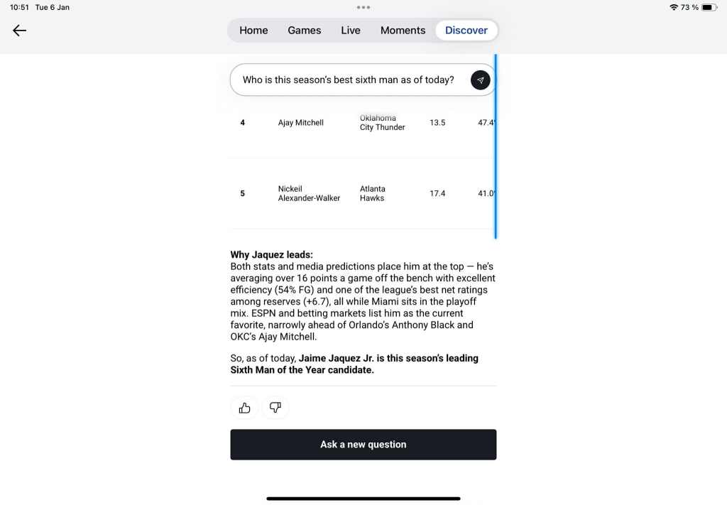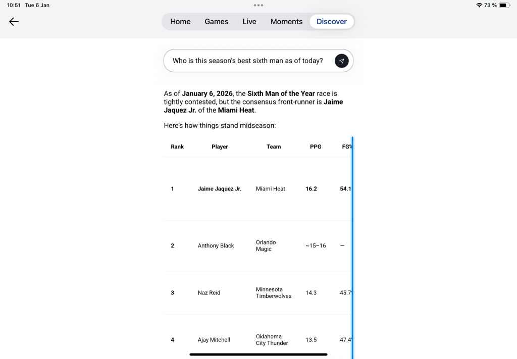 In order to get over the jilted disappointment of our first query, we decided to get cute with some Sixth Man of the Year predictions about halfway through the season. Thankfully, our AI bot friend provided us with sounder insights, bundling some of the well-known usual suspects, Miami’s Jaime Jaquez Jr, Minnesota’s Naz Reid, and Atlanta’s Nickeil Alexander-Walker into its top 5 prediction. We also didn’t mind the neat written summary at the end, partly justifying the table analysis—the holistic approach addressing both media and betting markets feels like a faithful depiction of current day NBA zeitgeist chatter. However, its inability to report a precise points-per-game number for Orlando’s Anthony Black (on top of a completely absent field goal percentage…), continued to leave us perplexed.