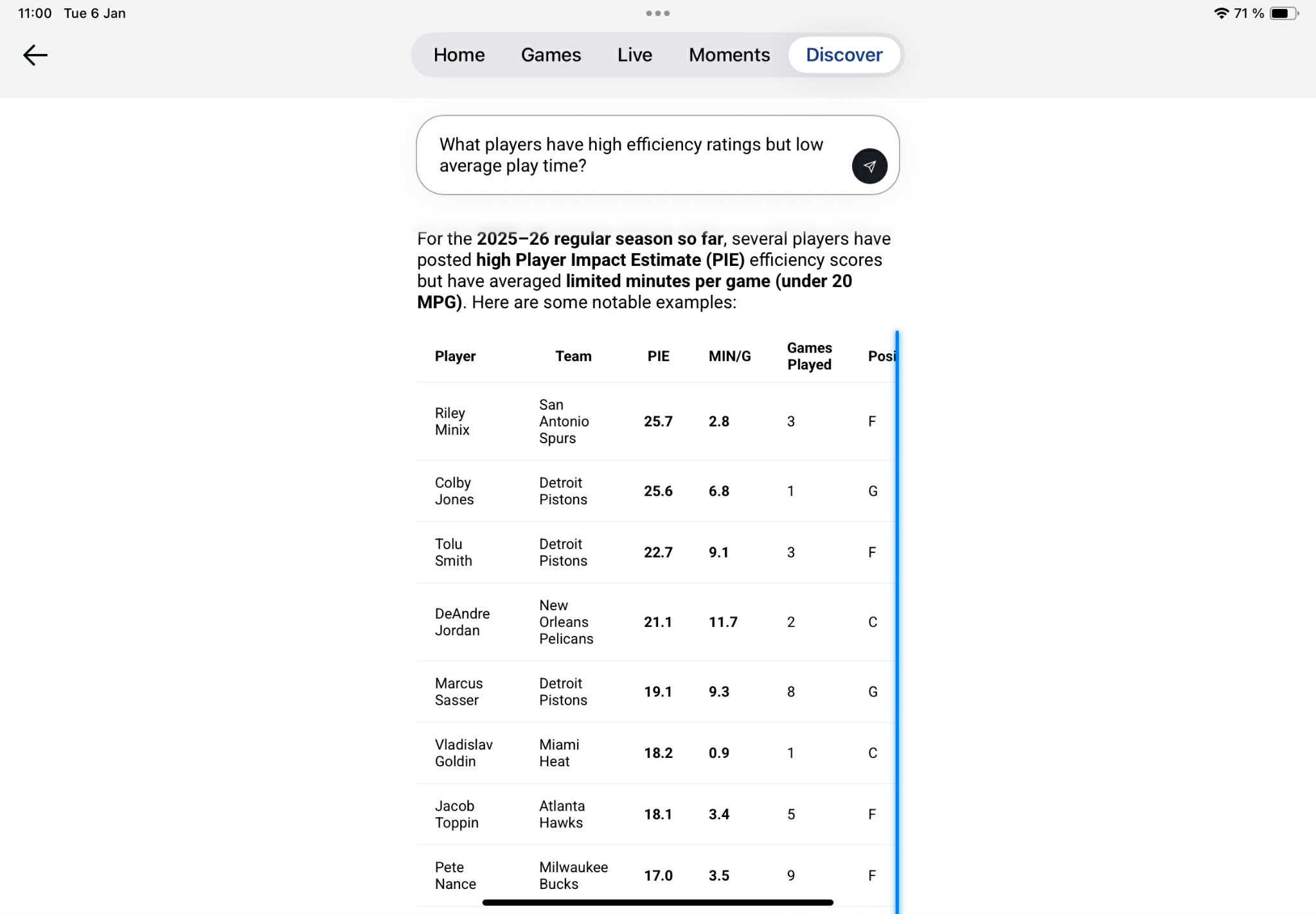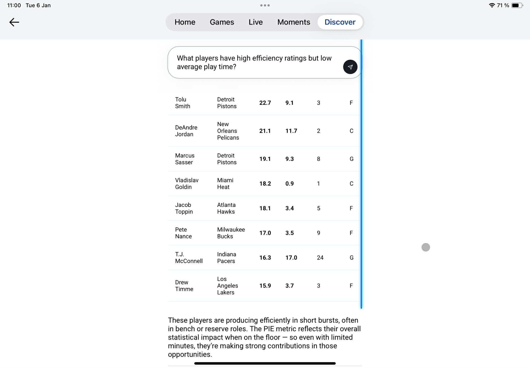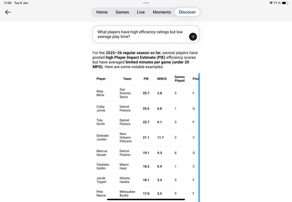 We then decided we wanted to test the NBA chatbot’s reasoning oomph by posing a more nuanced—if fascinating—question revolving around potentially unsung ‘diamonds in the rough’ players. We asked for its analysis over what players have been boasting above-average efficiency impact ratings but low playing time. In other words, we were hoping to alley oop NBA head coaches who read this site with allegedly untapped potential on their bench. To drive its insights this time, the chatbot opted for the NBA’s Player Impact Estimate (PIE), a league metric purported to show a player’s percentage contribution to all game boxscore events in totality (points, rebounds, assists, etc.), calculated using a simple and straightforward custom formula:
