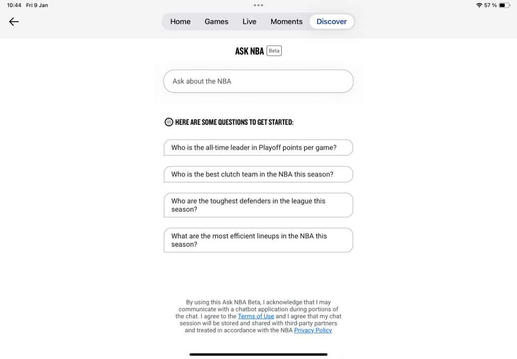 Believe it or not, we too like to have some little fun around here. We’re not just doom and gloom fueled by sad Ryan Adams reviews all the time. So recently we spotted a new sus AI feature in the official NBA app, one that has hitherto been kept surprisingly quiet. At the time of this writing, the ‘Ask NBA (Beta)’ module can be located in the ‘Around the League’ section under the ‘Discover’ tab as part of the native iOS interface. Currently, it’s being described as a “chatbot application” by the NBA’s fine print lodged at the bottom of the start screen: