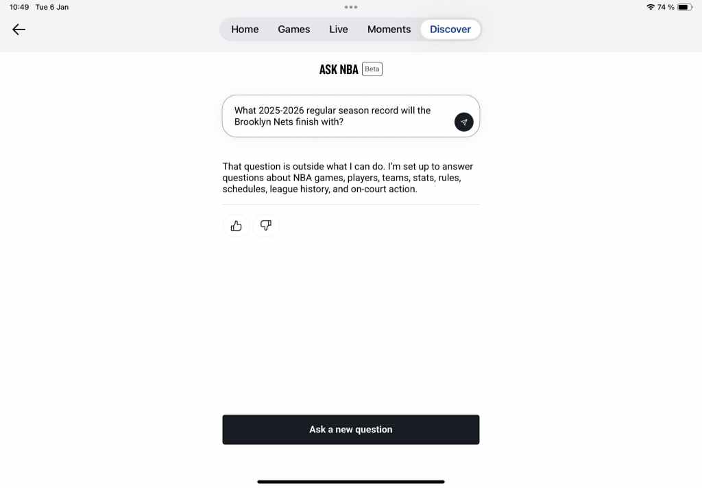 This brings us to our pièce de résistance. Just in case the coaching staff hadn’t thought about it, we took it upon ourselves to try to boost the Brooklyn Nets’ mid-season performance review. Just because. Naturally, we began by daring the NBA AI to predict the 2025-2026 regular season record for the New York franchise, to which it annoyingly clarified it’s only set up to “answer questions about NBA games, players, teams, stats, rules, schedules, league history, and on-court action”. Too bad none of these attributes contribute toward a team’s regular season record.
