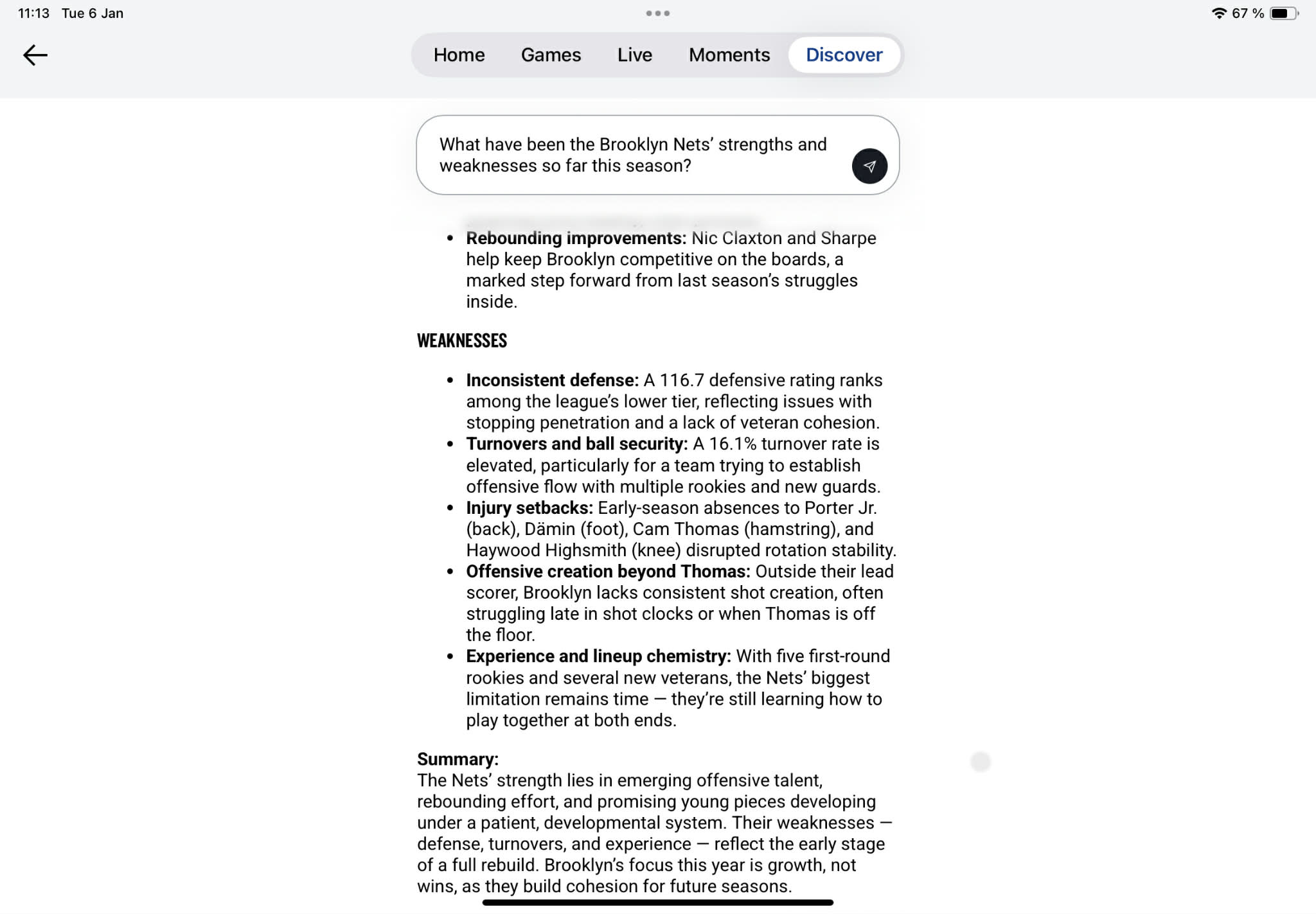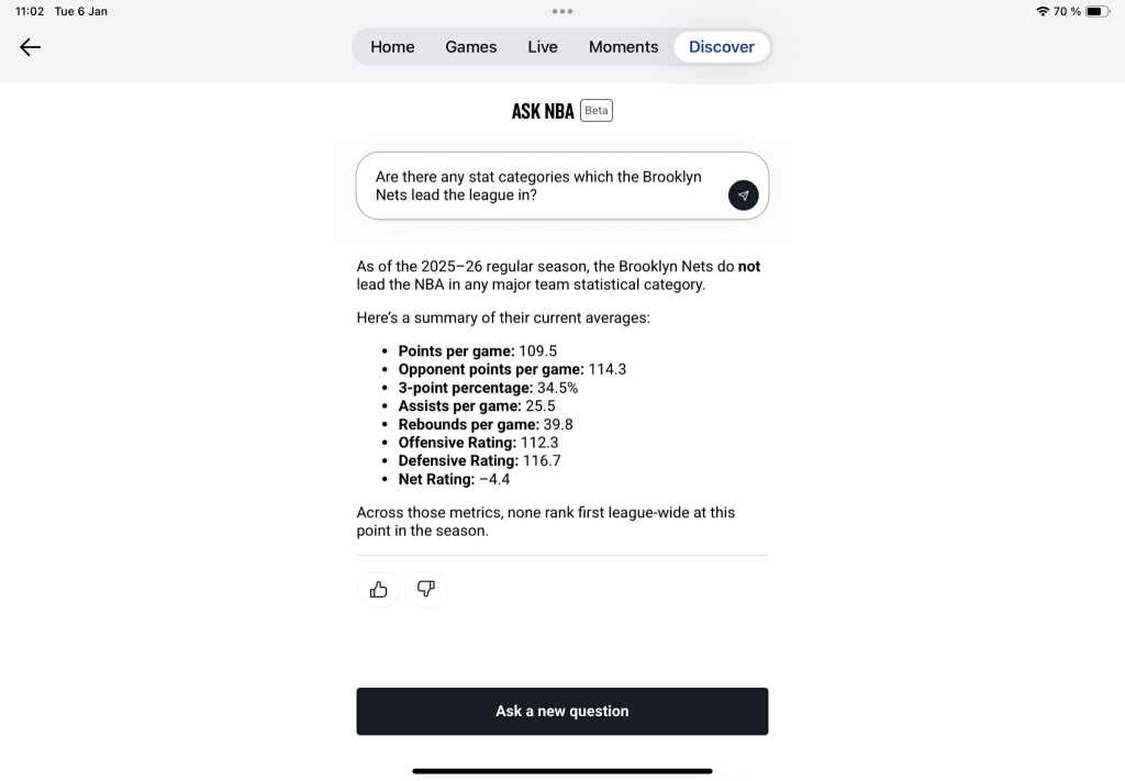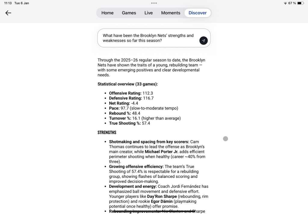 Simultaneously, the answer did not hold back and strongly reiterated the team’s inconsistent defense, high turnover rate, as well as early-season injury setbacks as grave issues still plaguing them. In addition to needing to whip up more offensive creation beyond Thomas (on top of MPJ, might we offer), the chatbot concluded by addressing the Nets’ lack of experience: “With five first-round rookies and several new veterans, [their] biggest limitation remains time—they’re still learning how to play together at both ends”. Incidentally, the sentence might well double as mad libs description for the state the NBA chatbot finds itself in. Much like the Brooklyn Nets, it’s keeping its development on the DL.