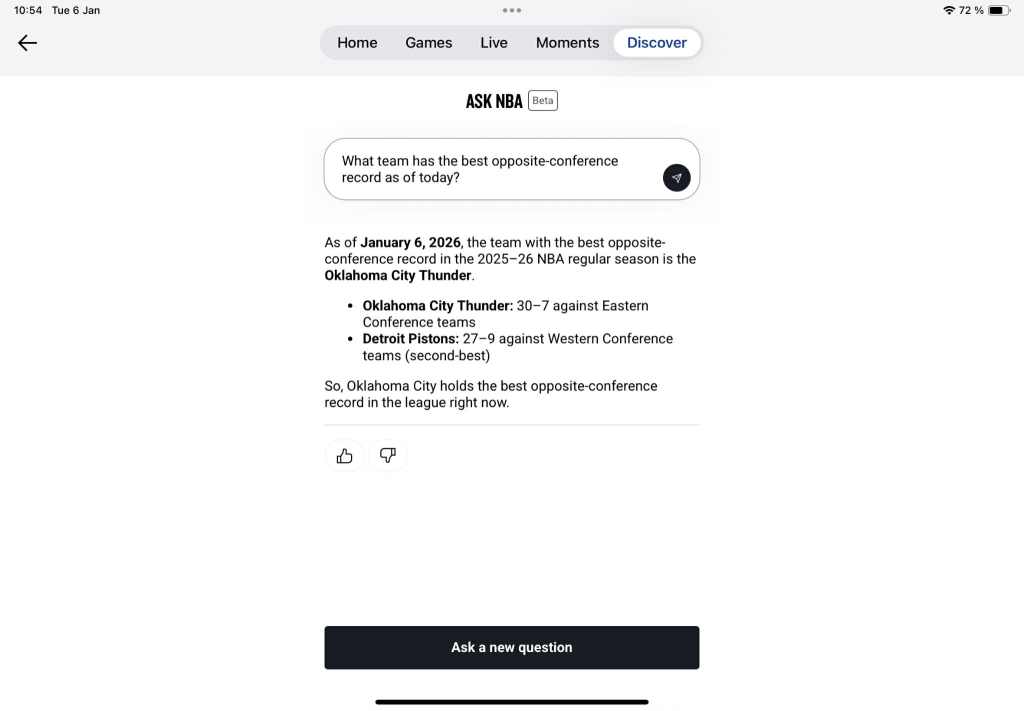 It didn’t start off… great. Below is the chatbot tripping over a somewhat banal data retrieval question about what team had been doing best in games against opponents outside of their league conference, just a few days ago. Alas, the NBA chatbot returned a plain answer listing the two teams at the top of the Easter and Western conferences at the time, citing their overall winning record instead of the opposite-conference one. (For the record, we did ask Google’s Gemini AI the same question—you know, the cannibalizing top search result that is swallowing the SEO market whole—and it did fall short of reporting such a trivial data point too…).